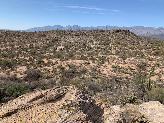 A view of the Santa Catalinas over a saguaro covered ridge from the rocky promontory. |